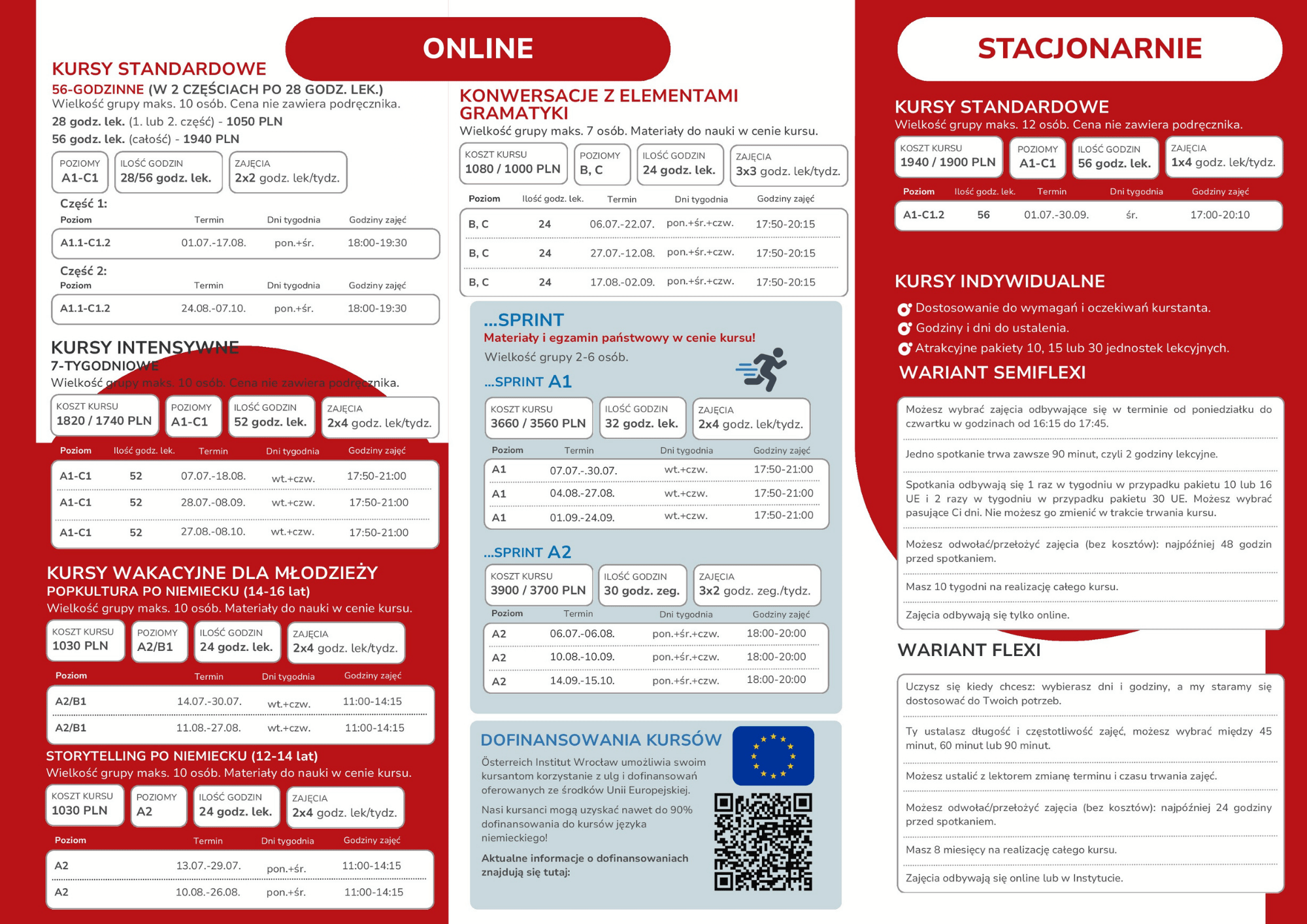 - Kursy intensywne to kursy dla osób, którym zależy na szybkich efektach. W 7,5 tygodni realizujemy program całego semestru. Grupy do max. 10 osób, poziom: A1-C1, cena: 1820 zł/kontynuacja 1740 zł.
